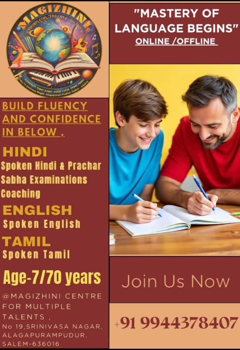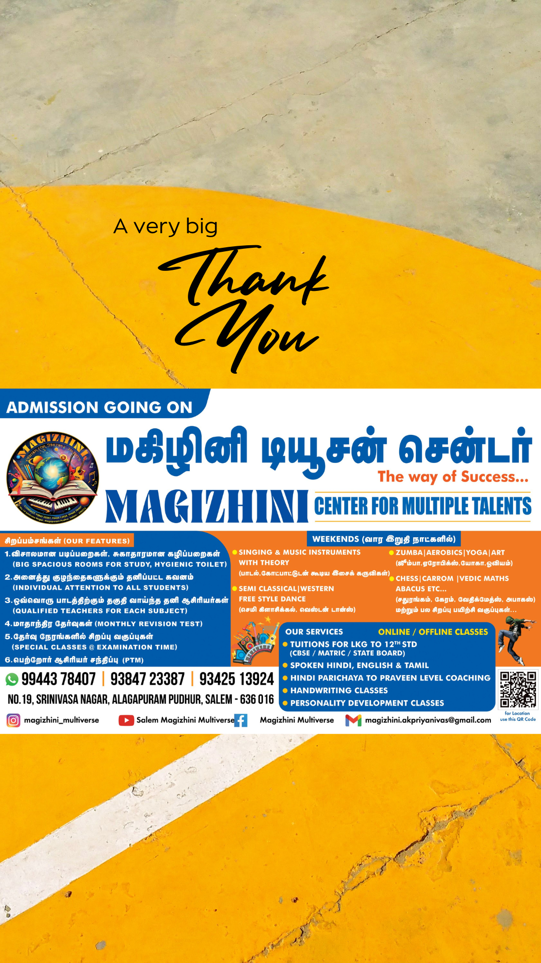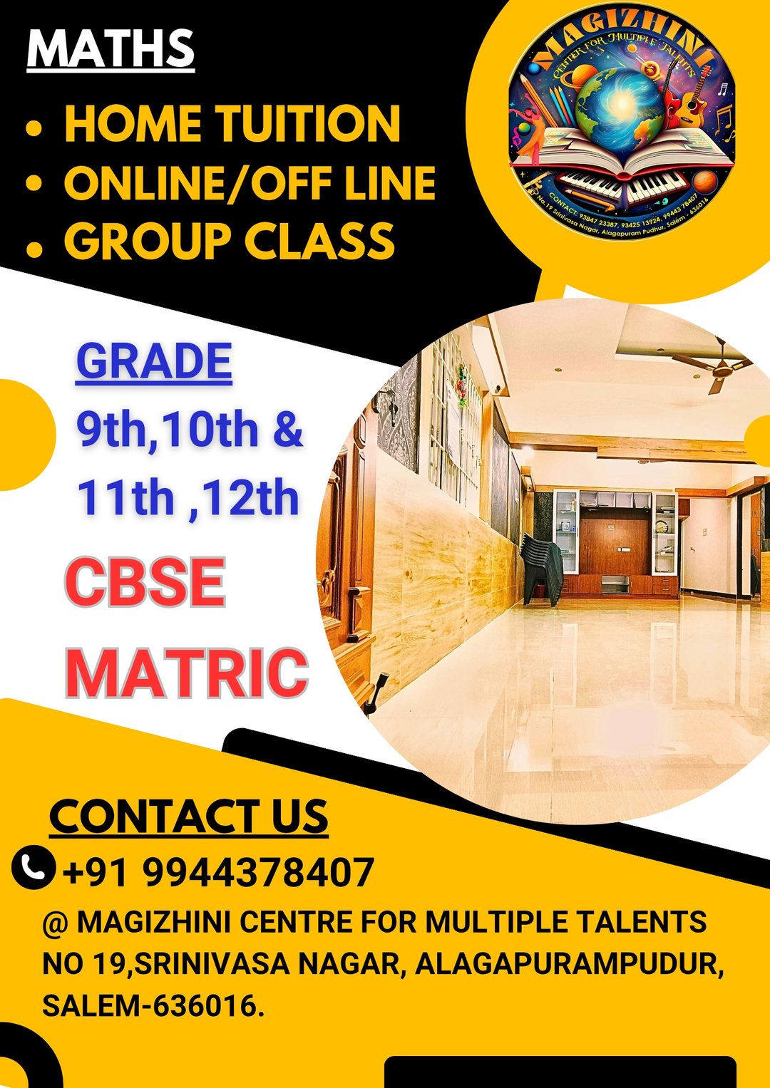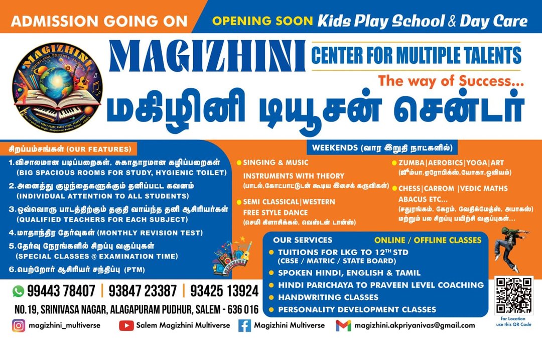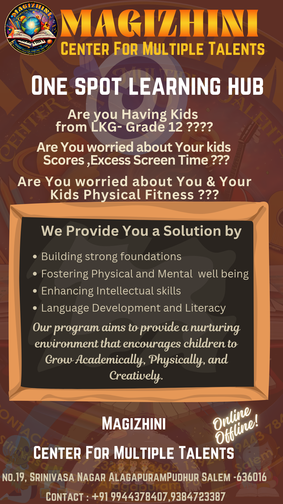 OUR SERVICES :(Online/Offline) Tuitions for Grade LKG to 12 th STD (CBSE/ Matric /StateBoard), Spoken Hindi/Tamil / English, Hindi Parichaya to Praveen level Exams Coaching Vedic Maths,Abacus,Phonics Hand writing classes WEEKEND SPECIAL: Western Freestyle Semiclassical Dance Aerobics, Zumba,Yoga Musical Instrument with Trinity Theory. Singing Art and craft Chess,Carrom Well Bigger place for Events like Birthday Parties and Conference with Hygiene Restrooms
